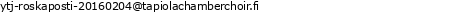 Tapiolan Kamarikuoro ry:n toimiala on Esittävät taiteet ja osoitteemme on Koukkuniementie 16 B 5, 02230 ESPOO. Tavoitatte meidät parhaiten sähköpostitse osoitteesta ytj-roskaposti-20160204@tapiolachamberchoir.fi. Lisätietoja toiminnastamme ja tarjoamistamme palveluista löydätte myös verkkosivultamme osoitteesta www.tapiolachamberchoir.fi Yrityksemme Y-tunnus on0998205-5. Meillä työskentelee keskimäärin1 - 4 henkilöä. Katso tarkempi sijaintimme oheiselta kartalta.